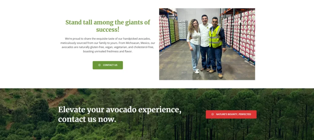 Web development example: Avocado supply chain website showcasing distribution for supermarkets, restaurants, and store chains.